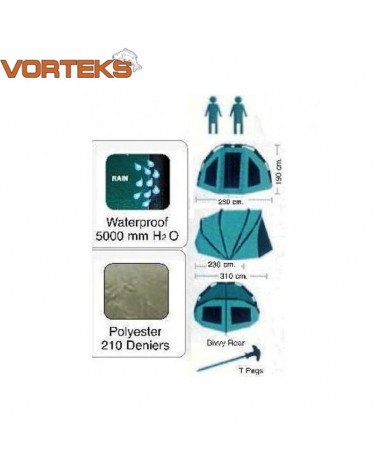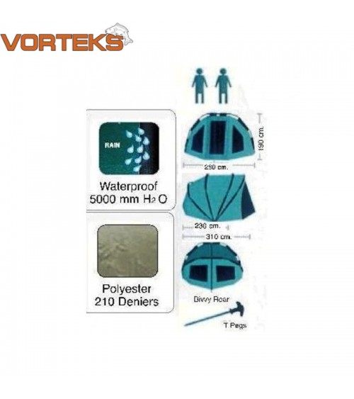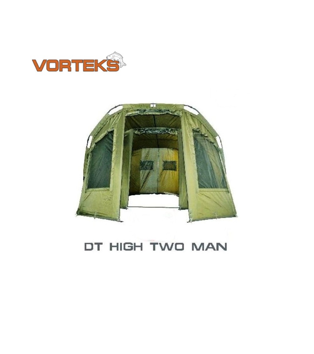 Vorteks DT Hight Two Man es el refugio perfecto para los pescadores de carpa. Equipado con suelo de PVC desmontable con cremalleras, estructura de tubo de aluminio y piquetas, fabricado con nylon/cordura de 210 deniards y resistente al agua 5000 mm HH. Capacidad para dos personas.